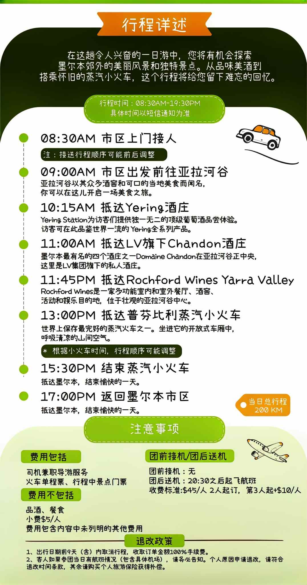 在这趟令人兴奋的一日游中,您将有机会探索墨尔本郊外的美丽风景和独特景点。从品味美酒到搭乘怀旧的蒸汽小火车,到探索亚拉河谷酒庄,这个行程将给您留下难忘的回忆。