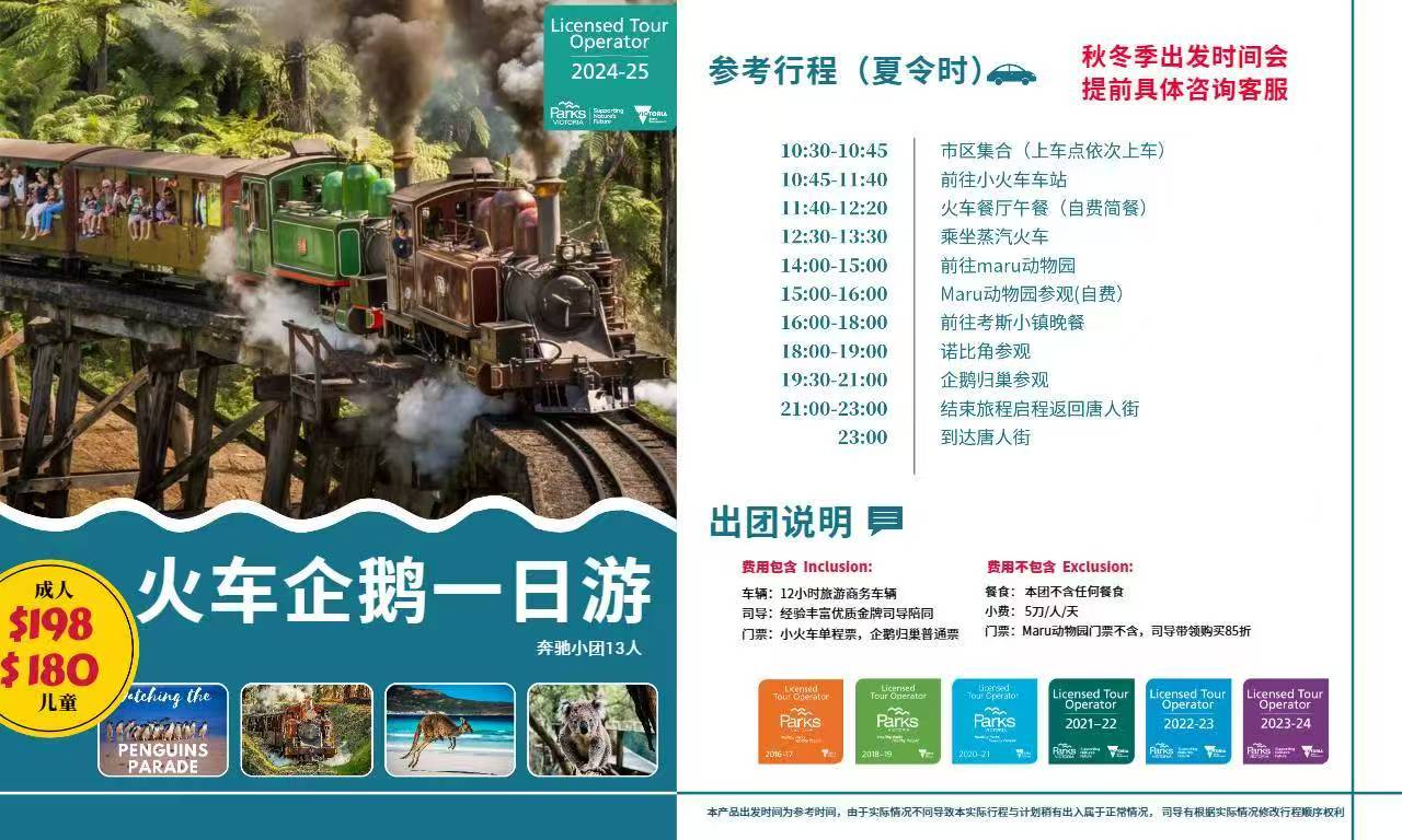 澳大利亚 | 墨尔本 古董蒸汽火车+企鹅岛一日游(13人奔驰小团)可选马鲁动物园或月光动物园