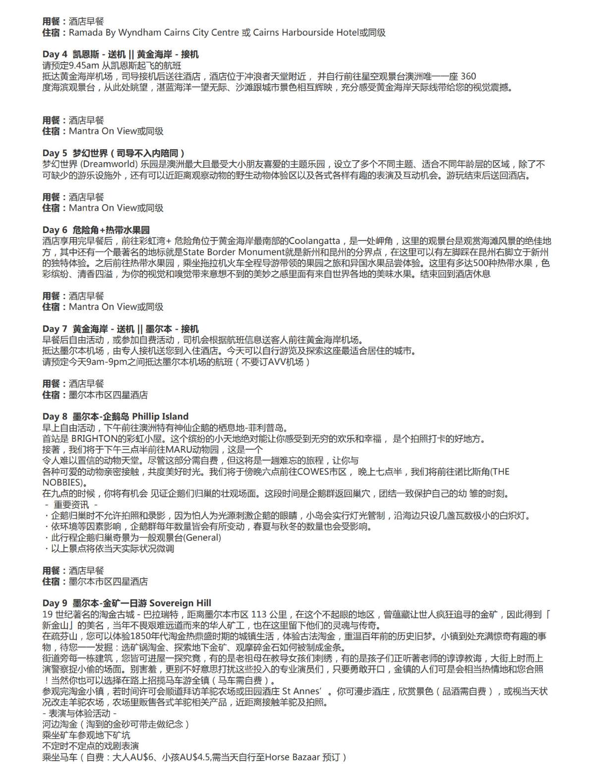 凯恩斯-库兰达雨林-太阳号外堡礁-黄金海岸-梦幻世界-危险角-热带水果世界-墨尔本 -企鹅岛-金矿-大洋路