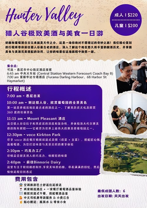 奶酪和葡萄酒自古以来就是天作之合,这是一场你绝对不想错过的奇妙之旅!我们精心策划 的行程将带你前往猎人谷最古老的酒庄,深入了解这个地区悠久而丰富的酿酒历史,并掌握 美食与美酒完美搭配的诀窍,让你的味蕾在这场旅程中焕然一新。