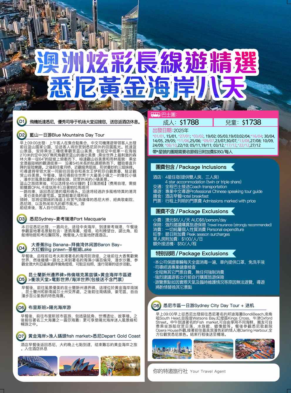 澳大利亚 | 悉尼往返 =布里斯班+阳光海岸+中央海岸+黄金海岸8日游(中文巴士长途团)固定日期发团
