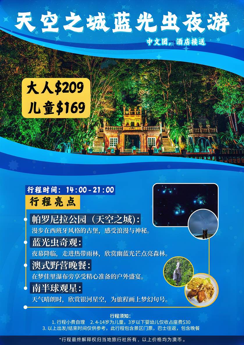 澳大利亚 | 凯恩斯往返 天空之城&蓝光虫夜游(中文导游,市区酒店接送)