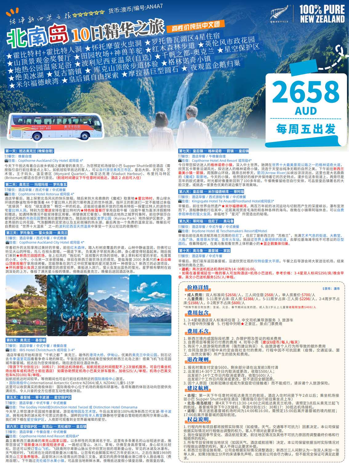 ★ 霍比特村 ★ 怀托摩萤火虫洞 ★ 地热之城罗托鲁瓦 ★ 田园农场 ★ 红木森林步道 ★ 白云峰山顶金奖景观餐厅 ★千帆之都奥克兰 ★ 星空保护区 ★ 绝美冰湖 ★ 库克山顶级步道体验 ★格林诺奇小镇 ★ 复古箭镇 ★米尔福德峡湾 ★皇后镇自由探索 ★摩拉基巨型圆石 ★ 夜观蓝企鹅归巢