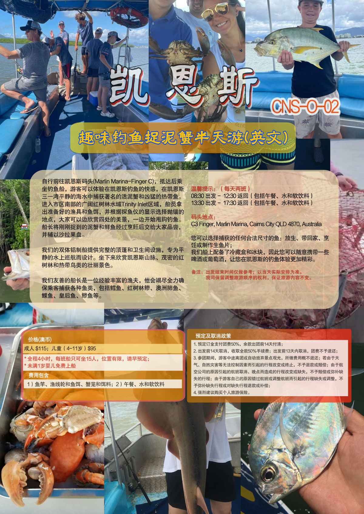 包括午餐、水和软饮料及捕蟹钓鱼用具;全程4小时, 每班船只可坐15人, 位置有限, 请早预定 未满1岁婴儿免费上船