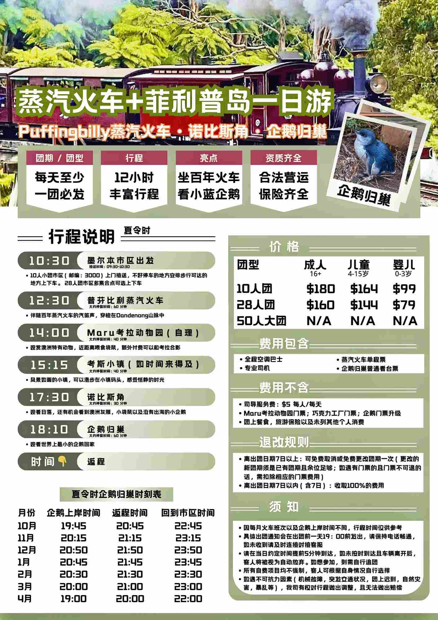 澳大利亚 | 墨尔本 蒸汽火车+企鹅岛+动物园(马鲁或月光)一日游(可选10人团,28人团)