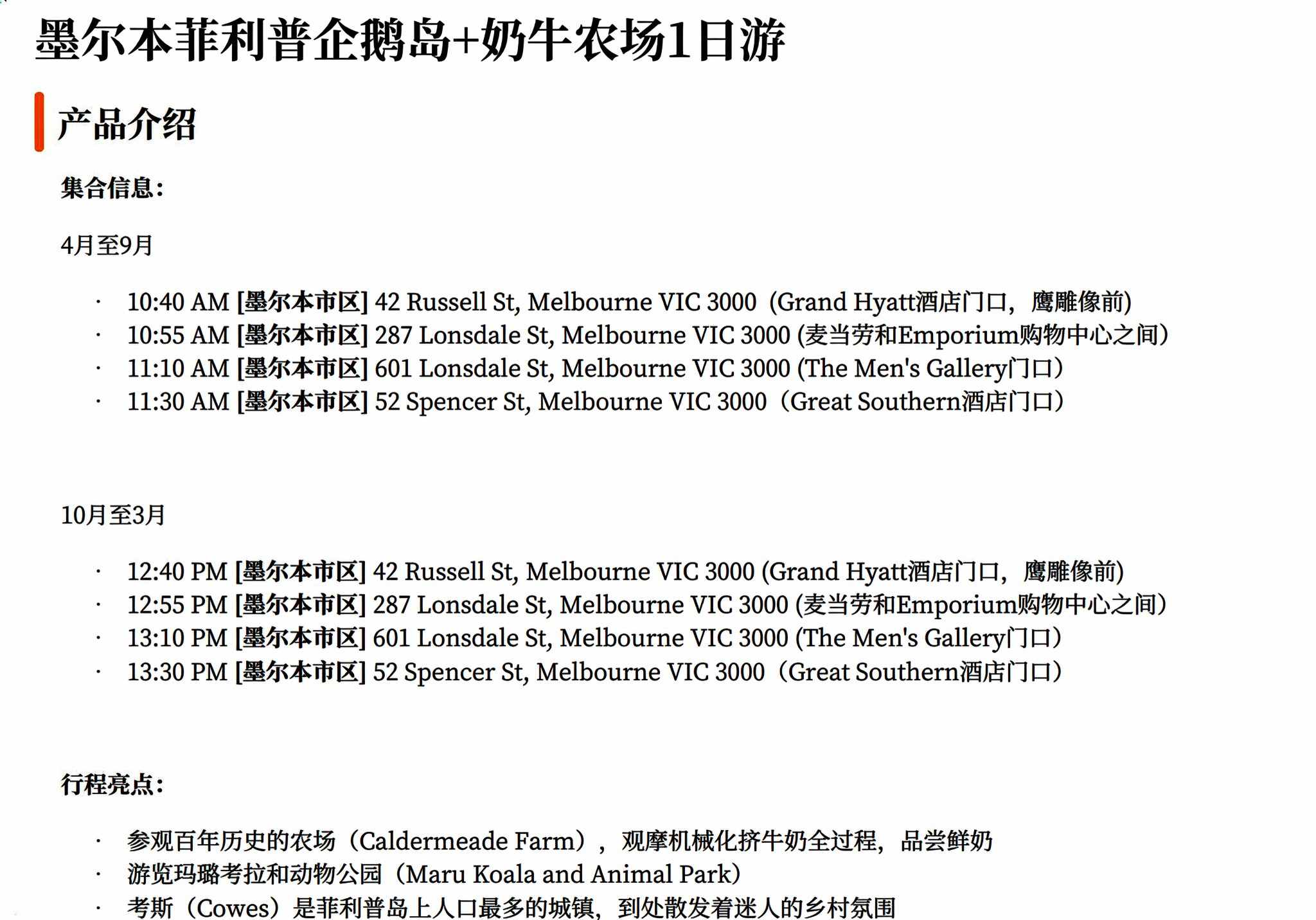 墨尔本本地一日游巴士团,中文导游,周二周六发团,4个固定集合点出发【预定请备注您选择的上车地点序号即可 N1:42 Russell St ;N2:287 Lonsdale St; N3: 601 Lonsdale St; N4: 52 Spencer St ]