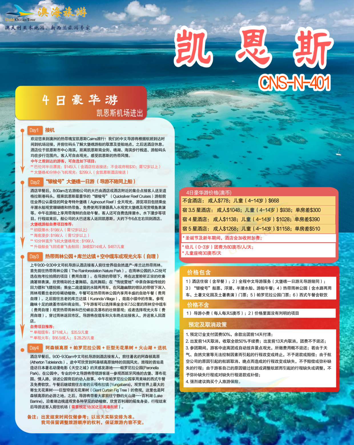 澳大利亚|凯恩斯大堡礁豪华4日全景游(酒店市区接送)