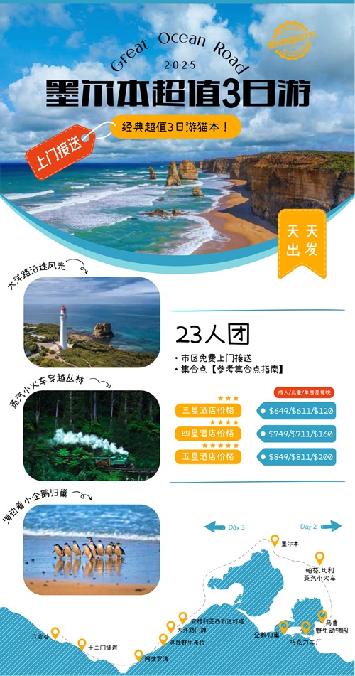 澳大利亚 | 墨尔本 超值三日游( 大洋路+十二门徒+古董火车+企鹅岛+接送机)小红帽灯塔路线取消(2025年12月15日起执行) 因旺季景区停车限流与运营压力: 小红帽灯塔路线即日起无限期取消